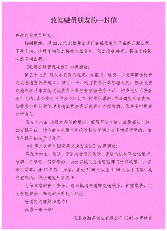 為進(jìn)一步整治收費(fèi)站沖卡、闖卡現(xiàn)象,融通公司S202收費(fèi)站結(jié)合工作實(shí)際,印發(fā)《致駕駛員朋友的一封信》,大力宣傳收費(fèi)站黑白名單系統(tǒng)升級工程,將闖關(guān)車輛及套牌車輛拉入收費(fèi)站系統(tǒng)黑名單,并全面解讀《收費(fèi)站公路管理?xiàng)l例》《中華人民共和國道路交通安全法》相關(guān)法律法規(guī)。
