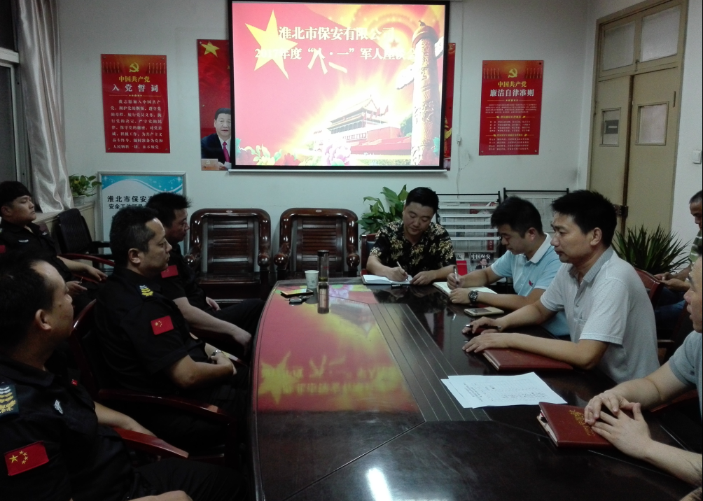 2017年7月27日下午19時,市保安公司"八一"建軍節(jié)座談會在二樓會議室舉行,金融武裝押運及人力防范退伍士兵隊員歡聚一堂,共慶光輝節(jié)日,共憶光榮傳統(tǒng),共敘魚水深情。