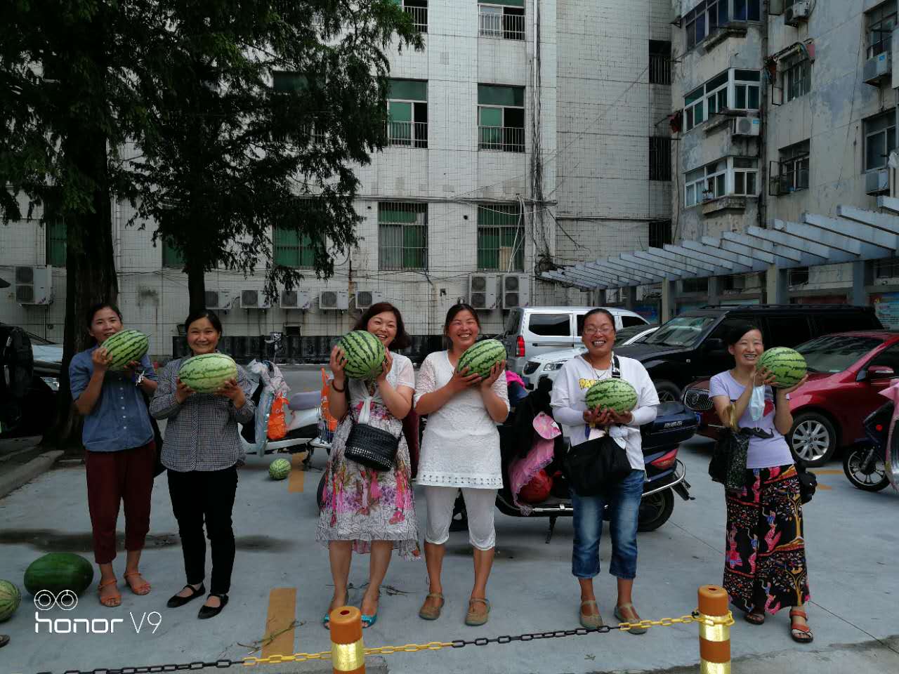 8月8日,城泊公司收費員在結束了一天辛勤的工作后,抱著一個個大西瓜露出燦爛的笑容。